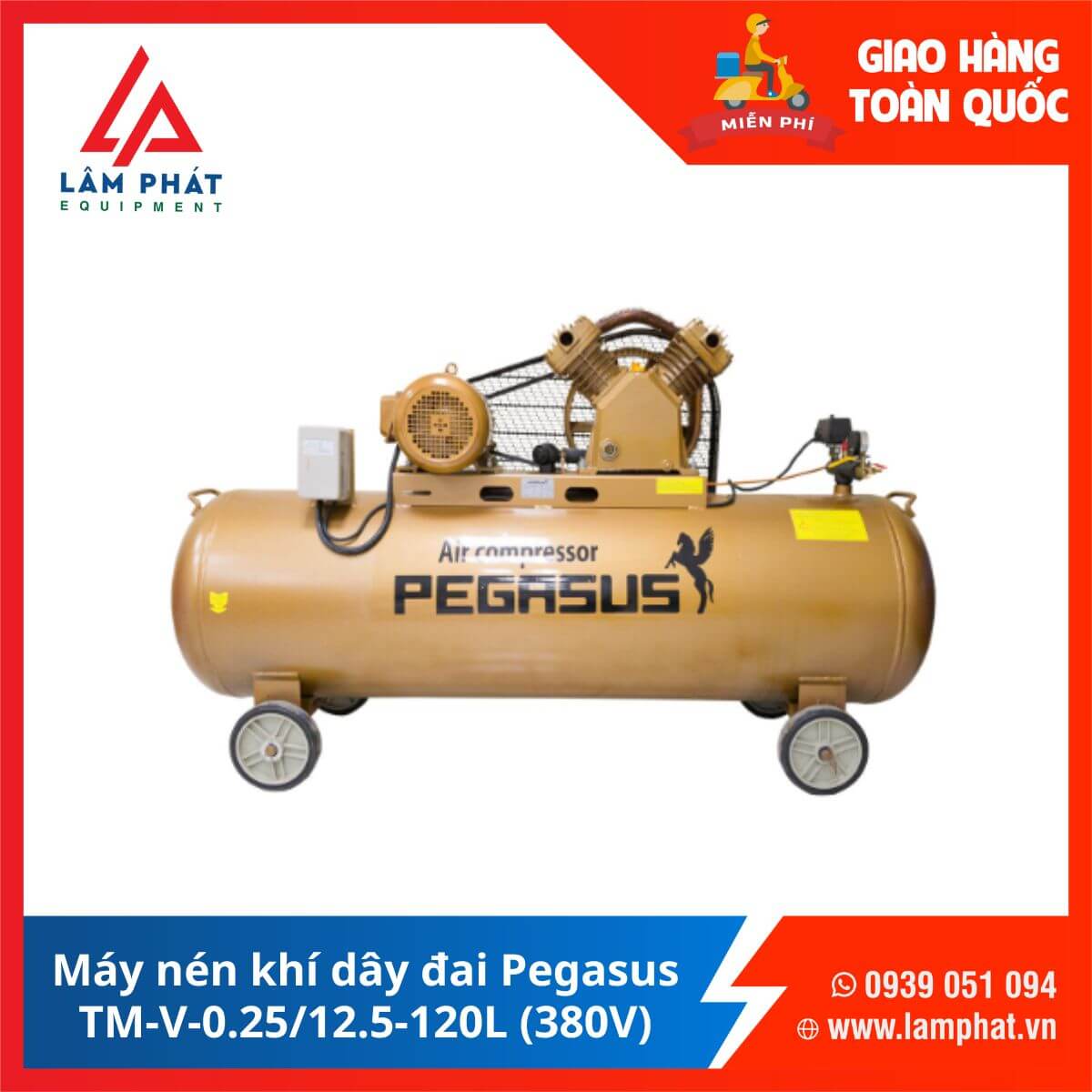 Máy nén khí dây đai Pegasus TM-V-0.25/8-120L (380V) với lưu lượng khí nén tối đa 250 lít/phút là một thiết bị mạnh mẽ và phù hợp với nguồn điện 3 pha. Đây là sự lựa chọn hàng đầu cho tiệm sửa xe máy quy mô vừa và lớn. Tìm hiểu thêm phía dưới bài viết!